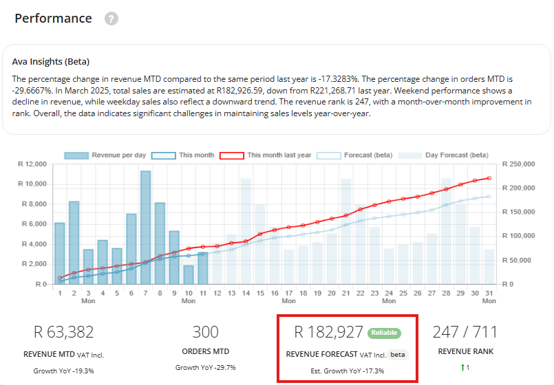YUMBI has introduced a sales forecast feature, now available on the Performance Graph in the Store Management Dashboard Report. This feature leverages a machine learning model that analyzes the past 26 months of sales and related data to predict daily revenue for the current month.